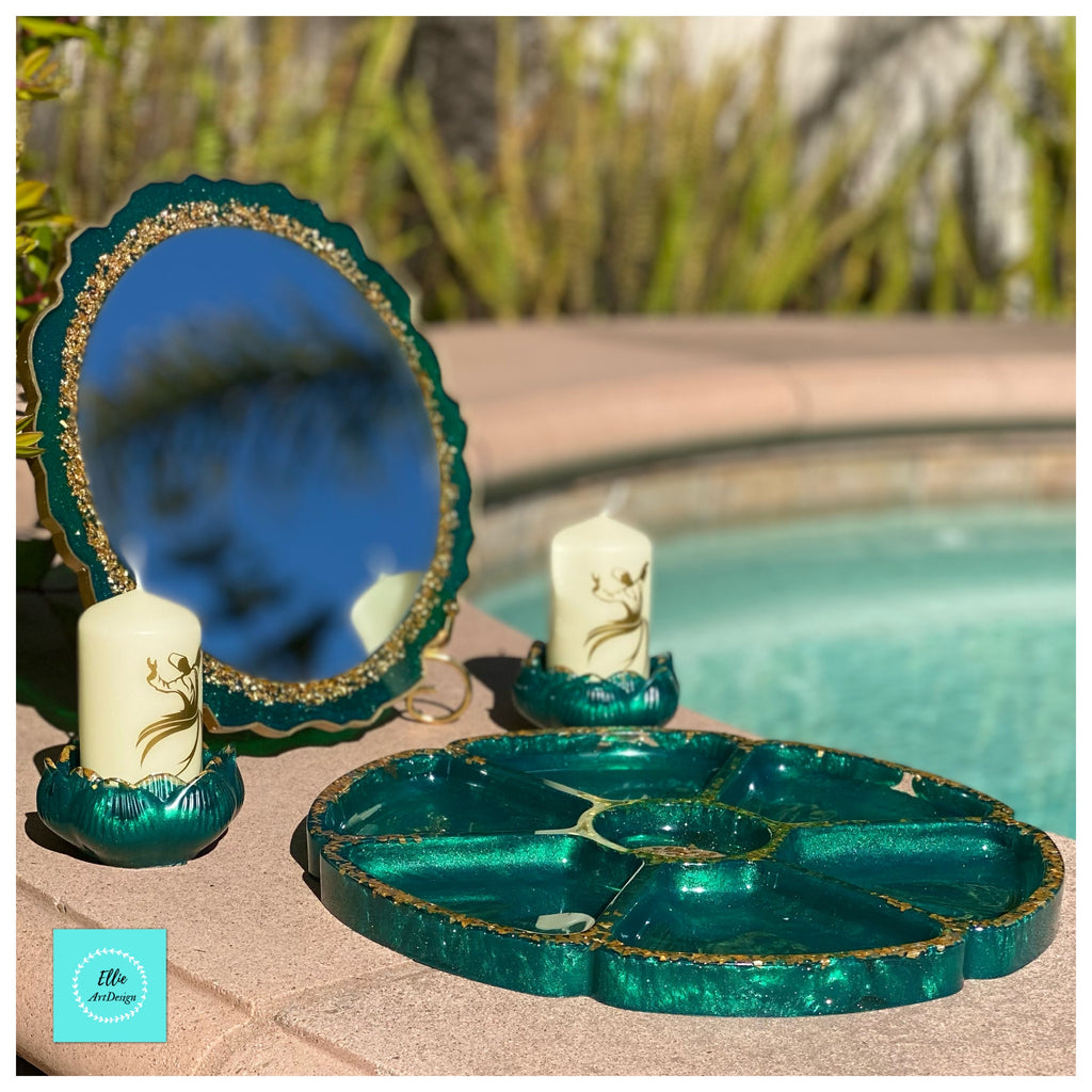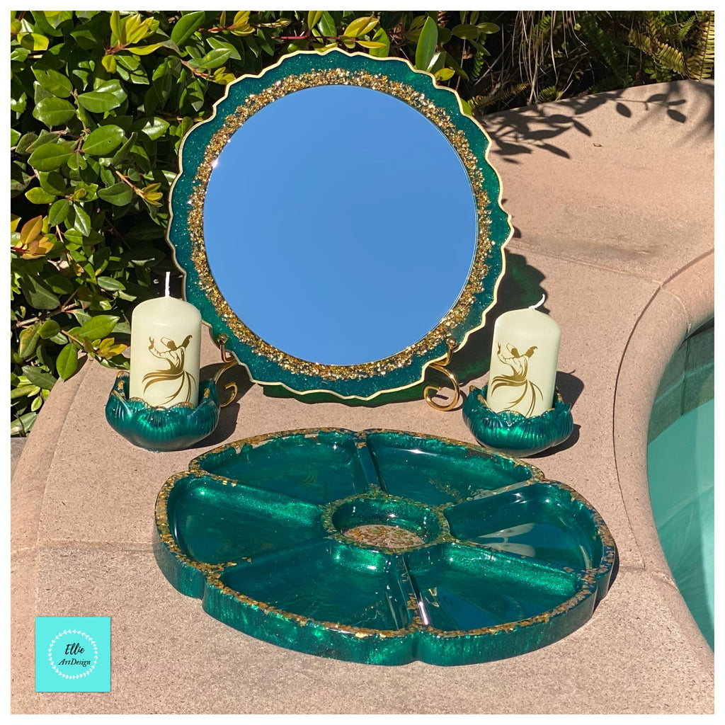 The set includes a mirror , the tray with 7 sections for your Haftsin items and two candle holders. The mirror stand and candles are included with set.